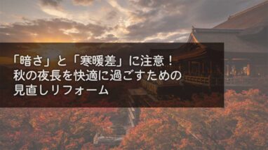 コラム 「暗さ」と「寒暖差」に注意!秋の夜長を快適に過ごすための見直しリフォーム 秋は日没が早まり、家の中や外が思った以上に暗くなる季節です。昼間は明るくても夜は一気に冷え込み、寒暖差によって体調を崩しやすくなります。こうした「暗さ」と「寒暖差」は、つまづきや転倒からくる事故や、慢... 2025.09.22 コラム